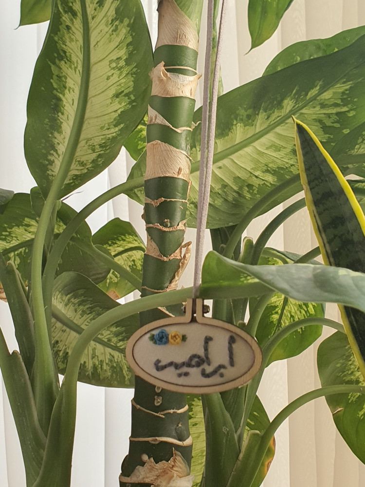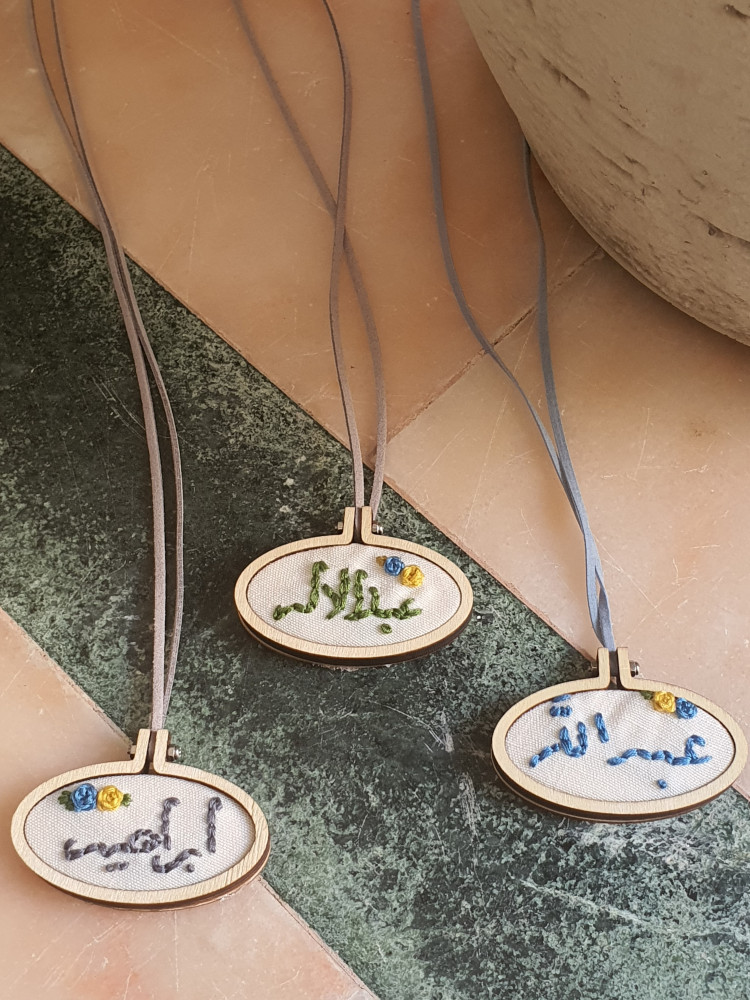 • تعليقة بيضاوية الشكل أنيقة مُطرزة خصيصاً لك, تأتي بمقاس 5 سم تقريباً.